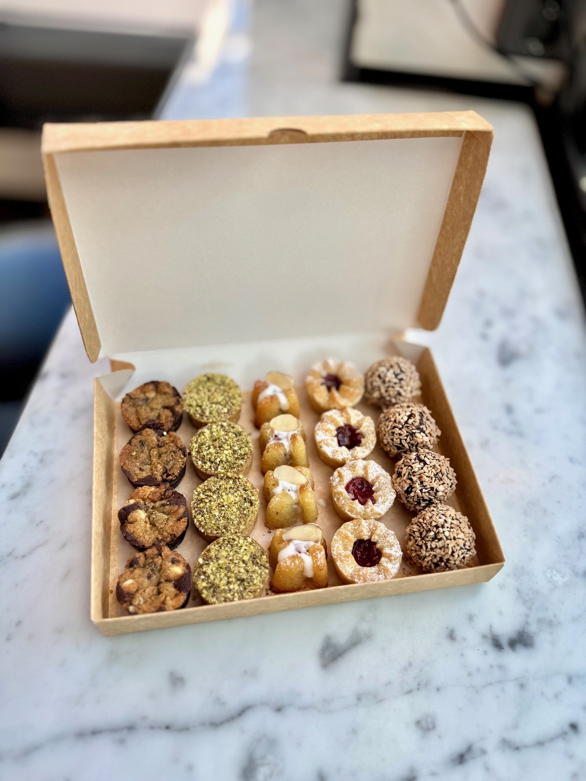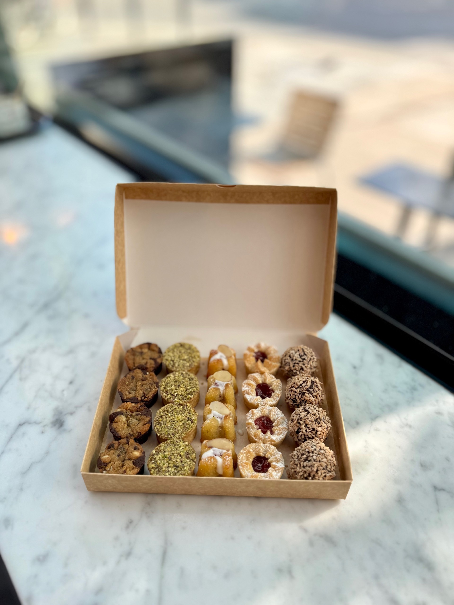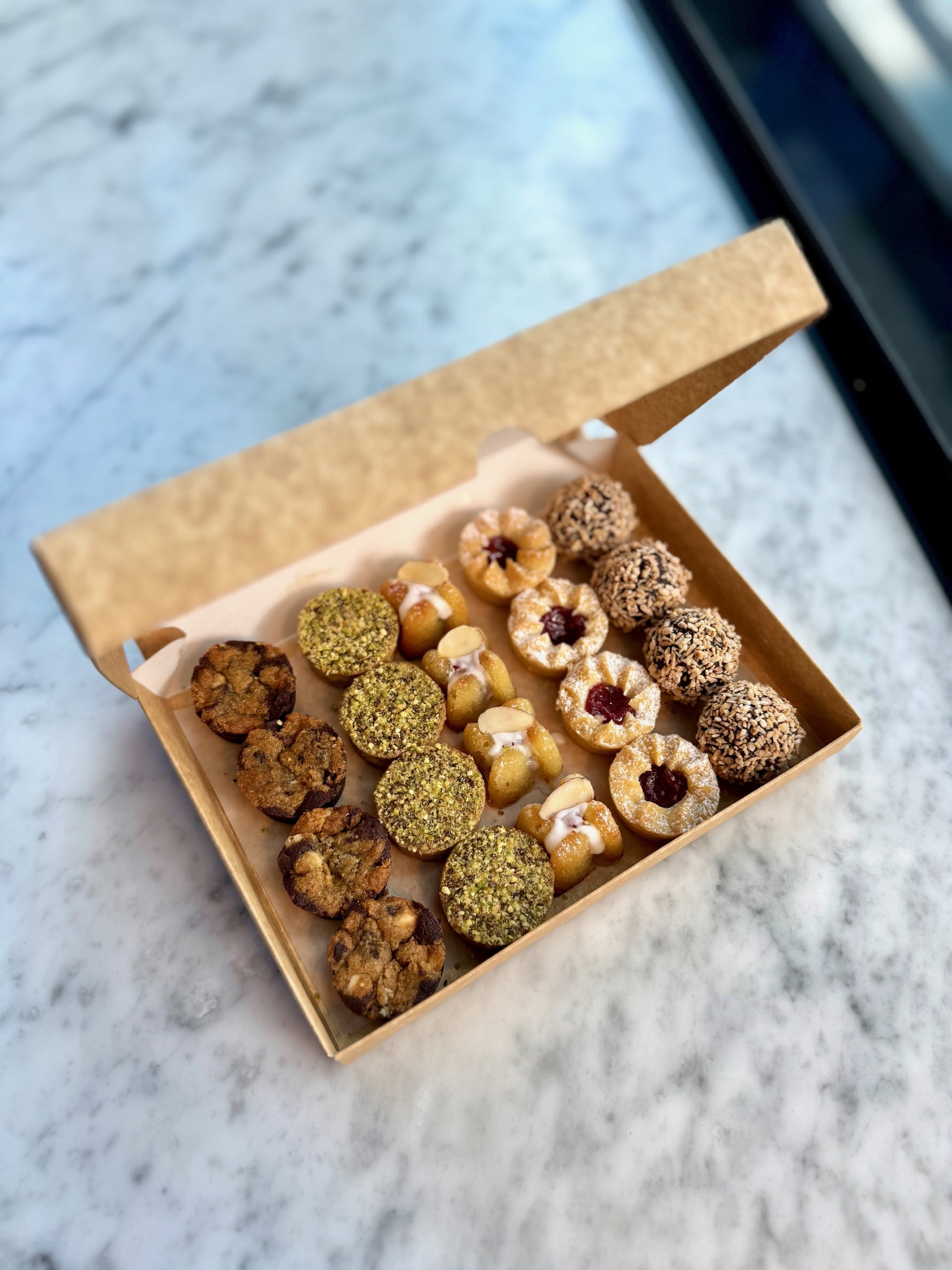 Pastöriserad GRÄDDE, salt, socker, kakaomassa, kakaosmör, emulgeringsmedel (SOJALECITIN), naturlig vaniljarom, VETEMJÖL, ÄGG, chokladchippits mörk (Kakaomassa, socker, kakaosmör, emulgeringsmedel (E322, E476), naturlig vaniljarom.), chokladchippits vit (Socker, kakaosmör, HELMJÖLKSPULVER, MJÖLKSOCKER, SKUMMJÖLKSPULVER, emulgeringsmedel E322, naturlig vanilj arom.), farinsocker strö (sackaros, maltodextrin, florsocker med potatisstärkelse, rörsockersirap), majsstärkelse, siktat DINKELVETE, florsocker, bikarbonat, vaniljextrakt, vaniljpulver, emulgeringsmedel (E471, E475), konserveringsmedel (E202), syra (citronsyra).