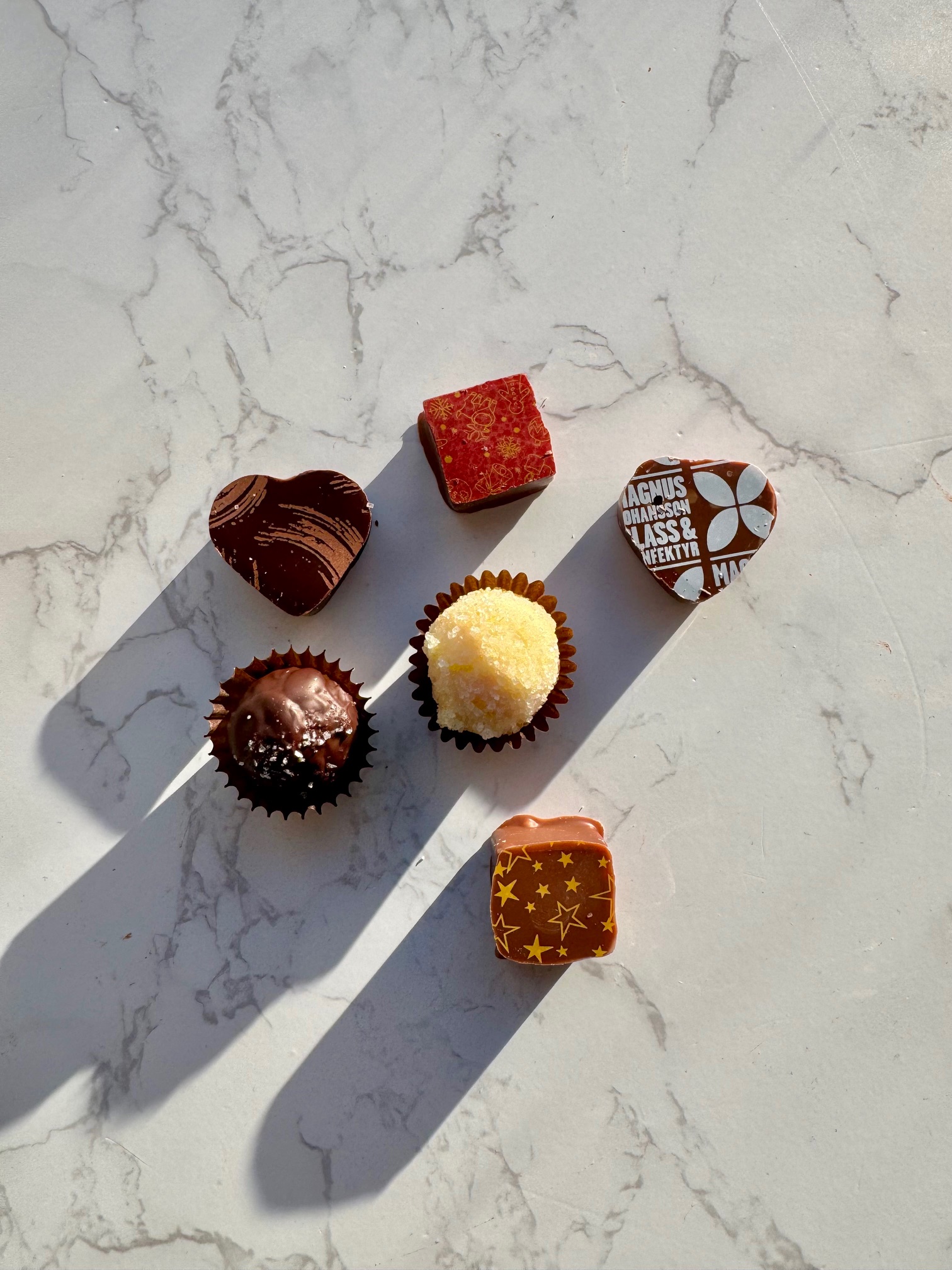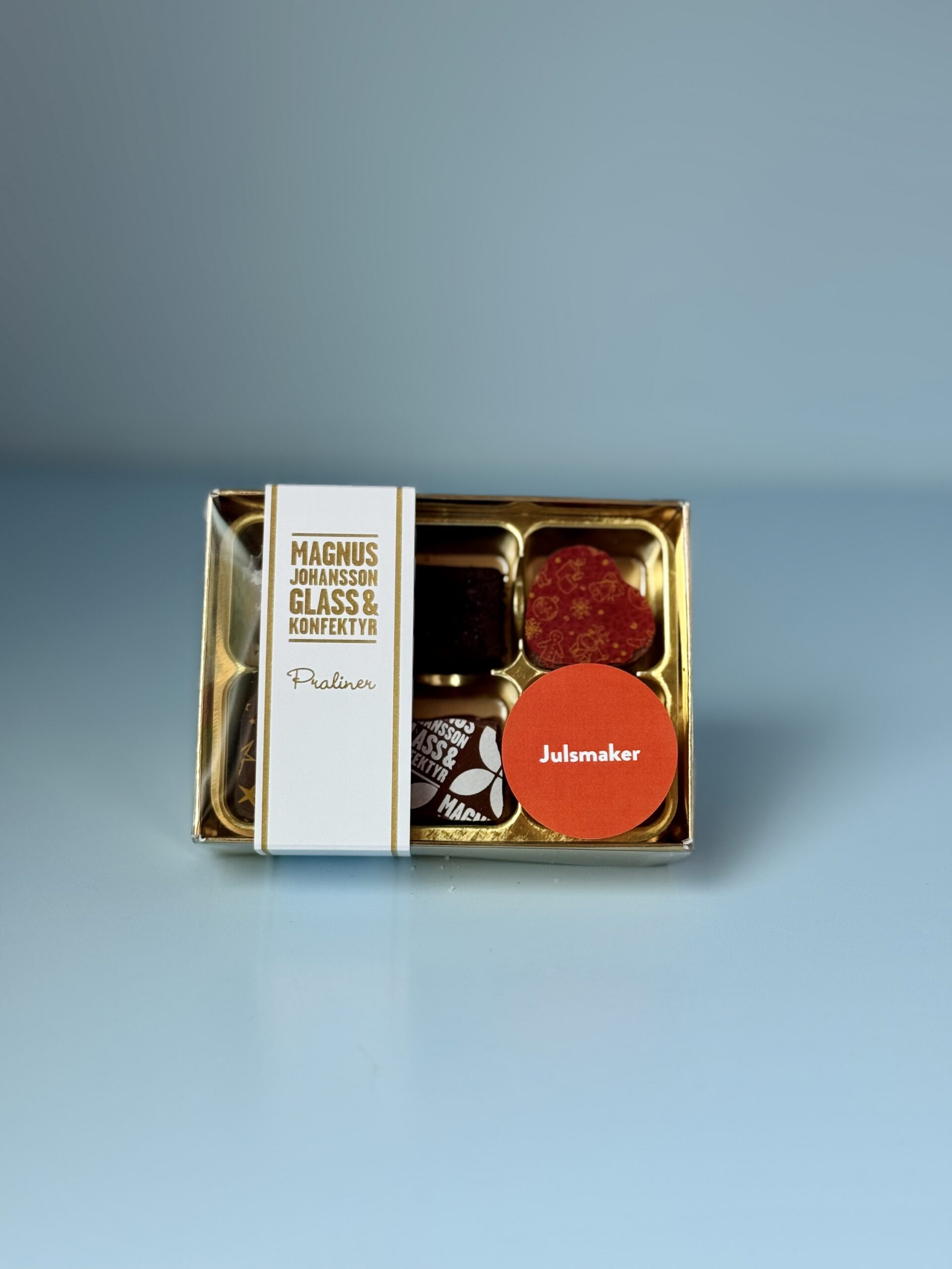 VISPGRÄDDE, socker, kakaosmör, kakaomassa, HELMJÖLKSPULVER, socker, glukossirap (4,2%), PISTAGENÖTTER (3,8%), Smör normalsaltat (pastöriserad GRÄDDE, mjölksyrakultur, salt), svart vinbärspuré (2,2%), honung(1,8%), trimolin(Kristalliserad invertsockersirap, vatten), konjak, SMÖR normalsaltat (pastöriserad GRÄDDE och salt), LAKTOS (MJÖLK), SKUMMJÖLKSPULVER, vodka, emulgeringsmedel: E322 (SOJA), kryddor (kanel, kardemumma, ingefära, kryddnejlika), apelsin färsk, saffran, vaniljstång, naturlig arom (vanilj).