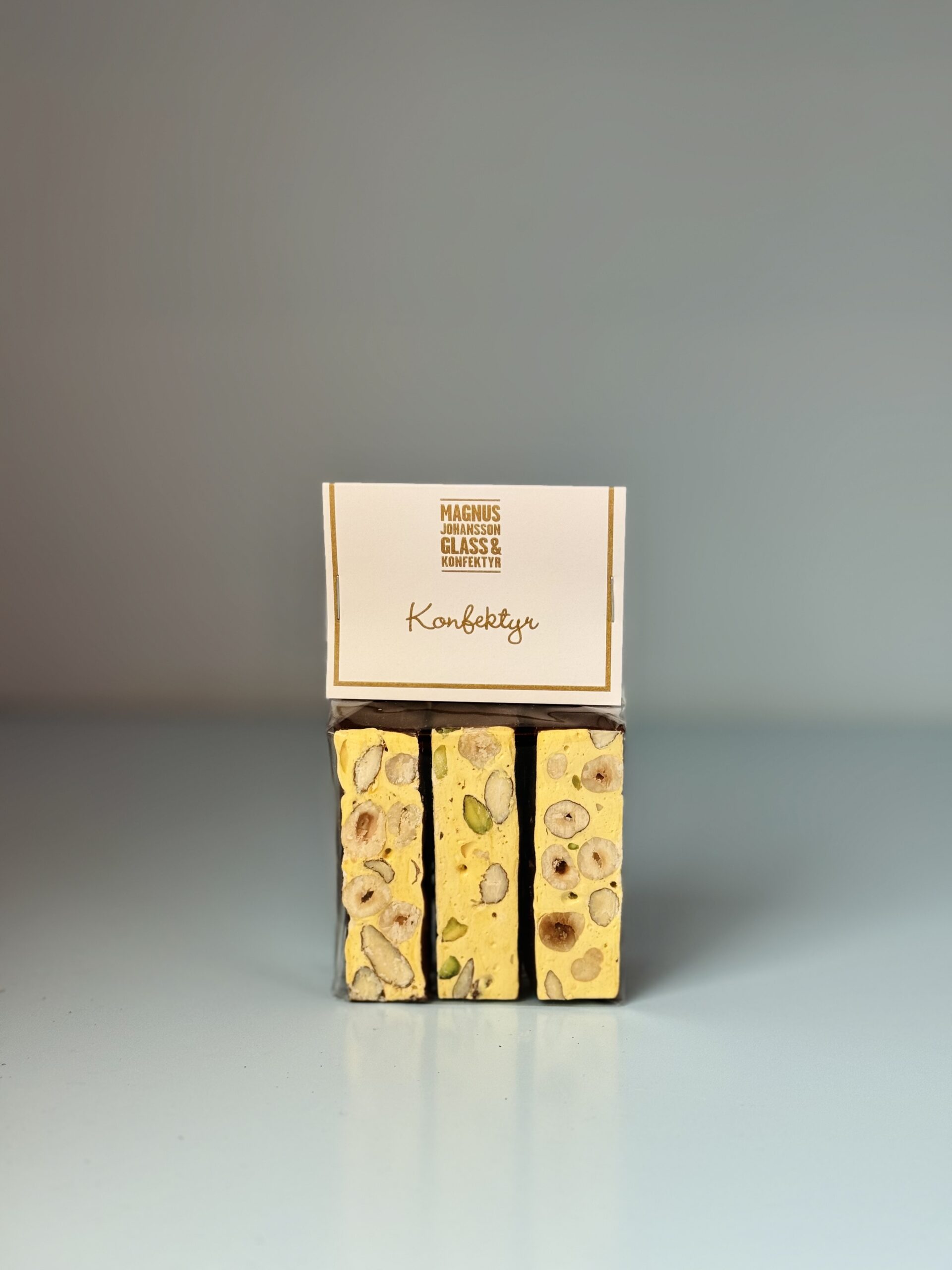 Nougat montelimar med saffran, hasselnötter, pistagenötter och mandlar doppad i mörk choklad.