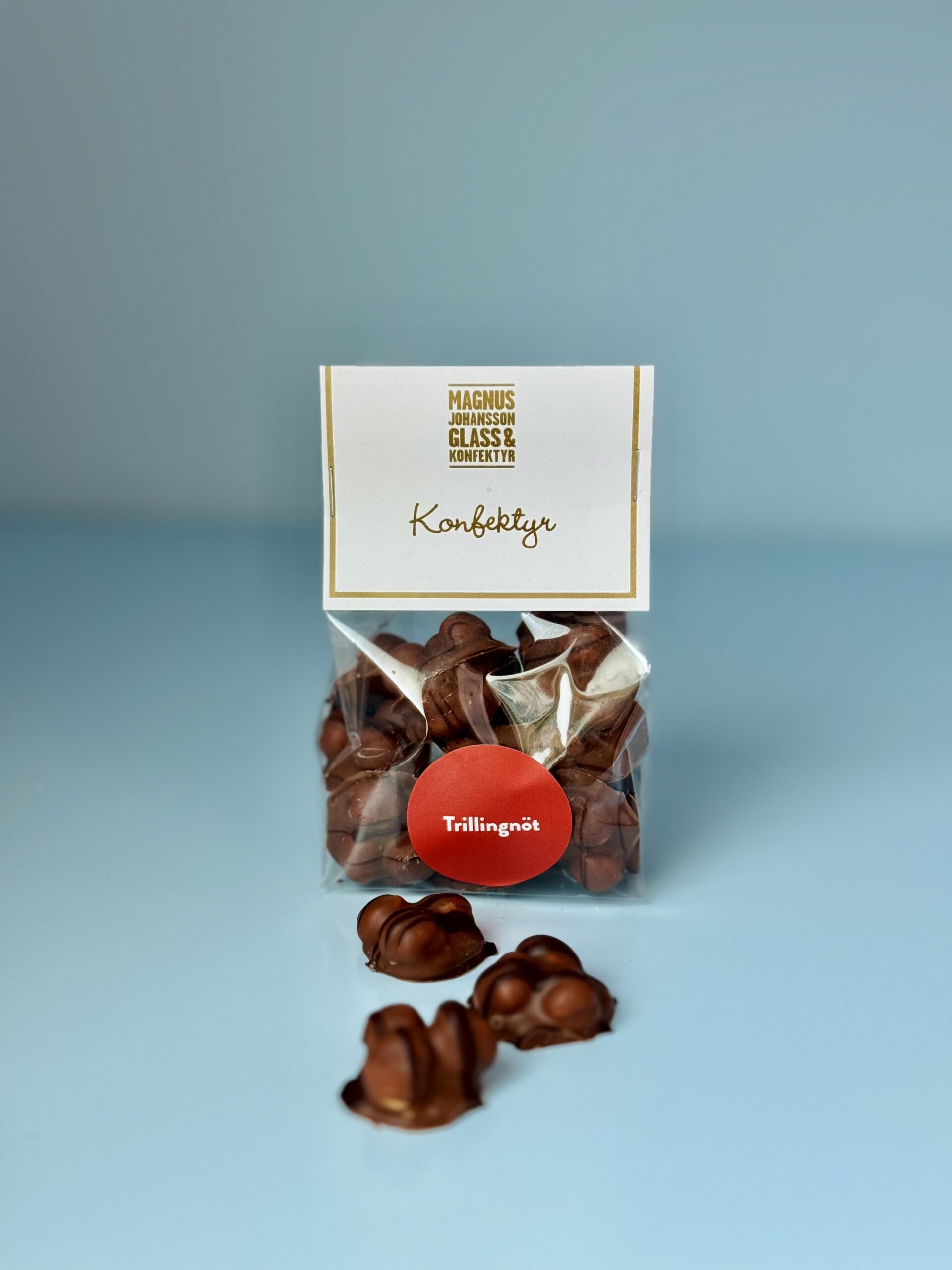 Innehåll: HASSELNÖTTER (37,5%), socker, kakaosmör, kakaomassa, HELMJÖLKSPULVER, emulgeringsmedel: E322 (SOJA), naturlig vaniljarom